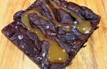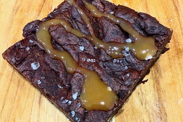 Butter, sugar, cocoa powder, vanilla extract, eggs, flour, chocolate chips, caramel syrup & salt, avocado oil