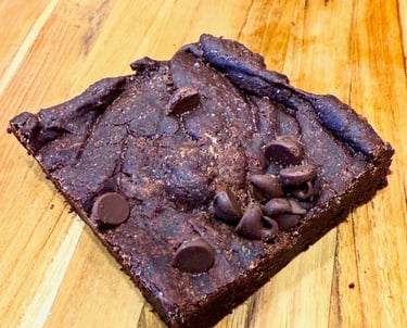 Butter, sugar, cocoa powder, vanilla extract, eggs, flour, chocolate chips, caramel syrup & salt, avocado oil